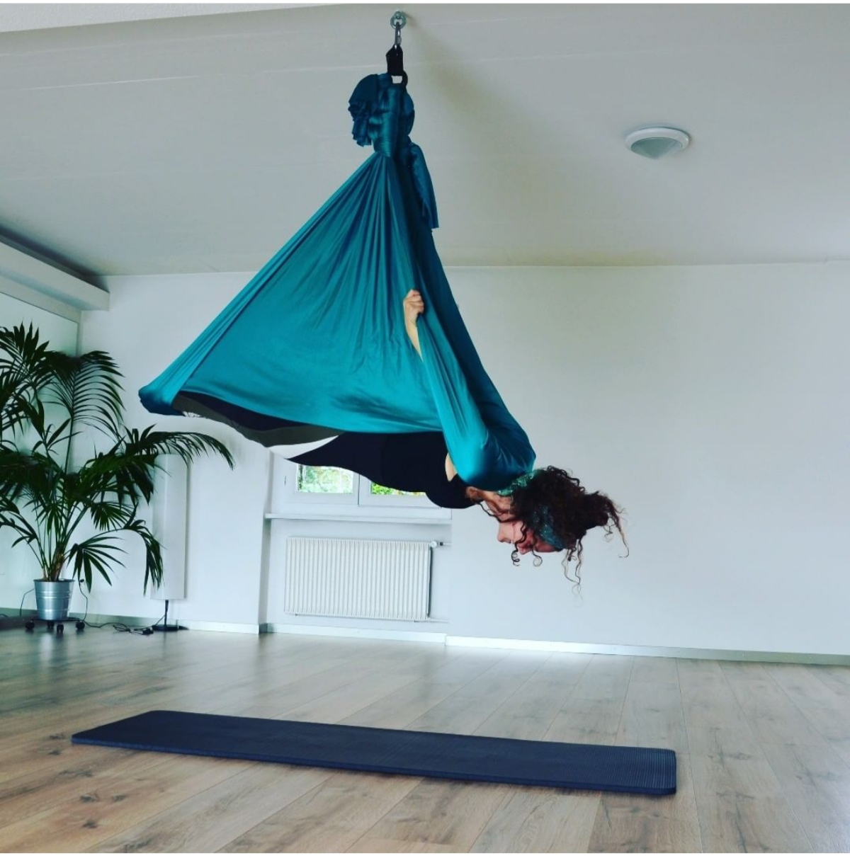 -Ich habe ein tragbares Gestell. Dafür müsste ich aber minimum zwei Privatstunden am Stück geben, damit sich der Aufbau und Transport lohnt. Das eignet sich nur für Aerial Yoga, AirFit und Aerial Sling Akrobatik.