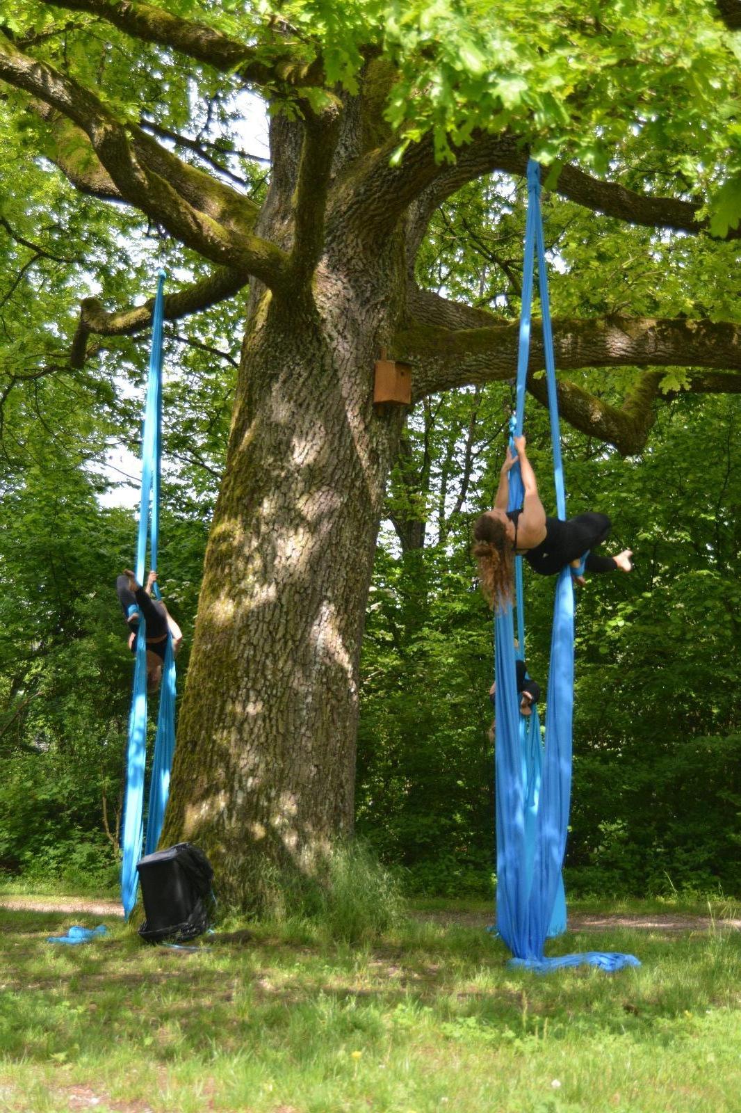 People on the Ground ist ein Vertikaltuch Trio. Enstanden an einem Baum. Der Baum ist in die Performance integriert. Dieses Stück kann jedoch auch für anderen Bäume/ Orte gebucht werden.